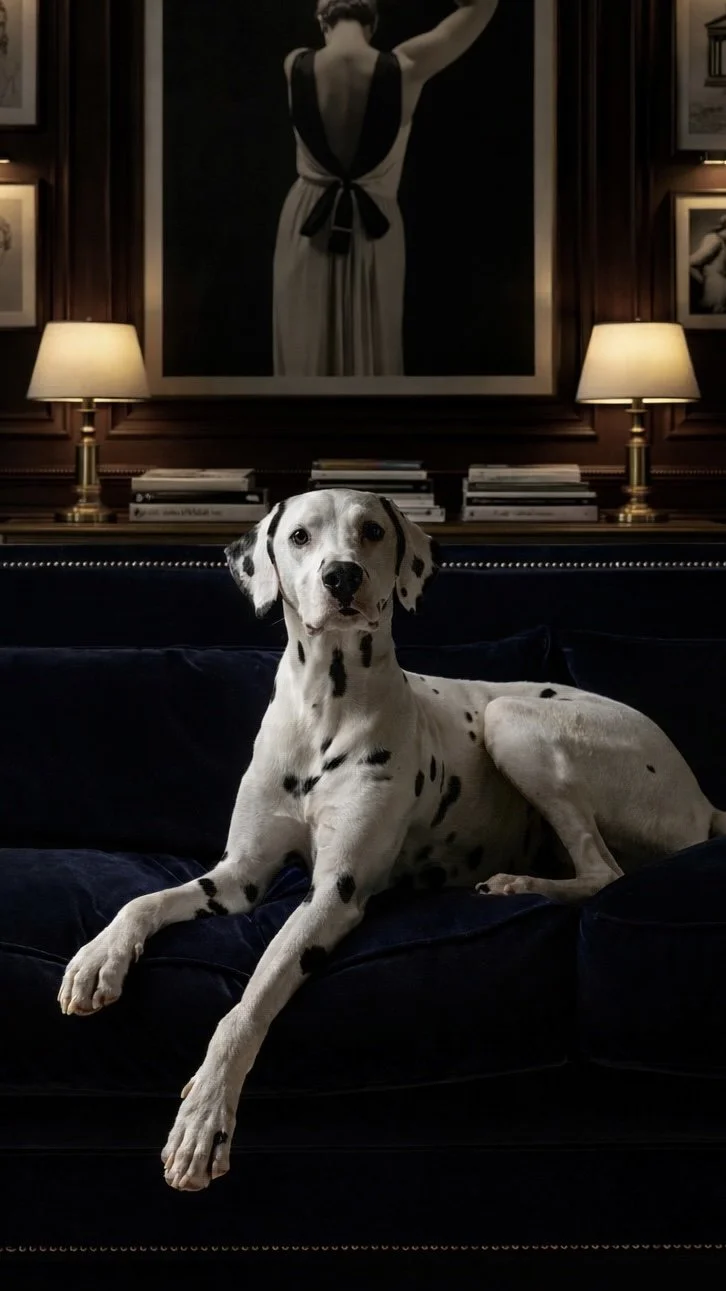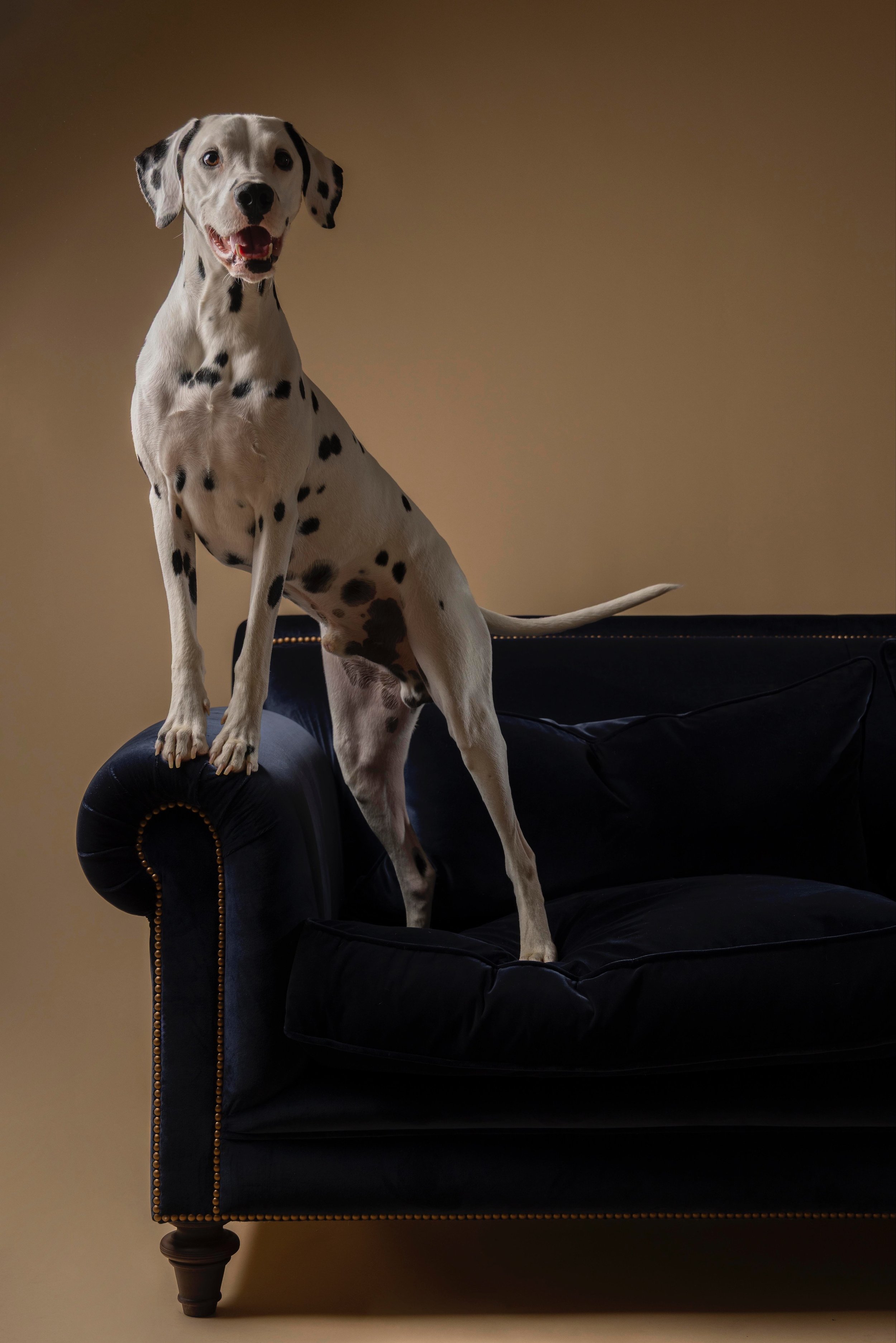 Upholstered in our Heritage Velvet, Ink; a rich, deep slate navy, the Haddleigh Sofa provided the perfect backdrop. Obi’s markings effortlessly created a striking contrast. He looked truly extraordinary. What made the experience even better was just how much fun it was to have him in the studio. Obi was impeccably well behaved calm, and completely unfazed by the cameras and activity around him.