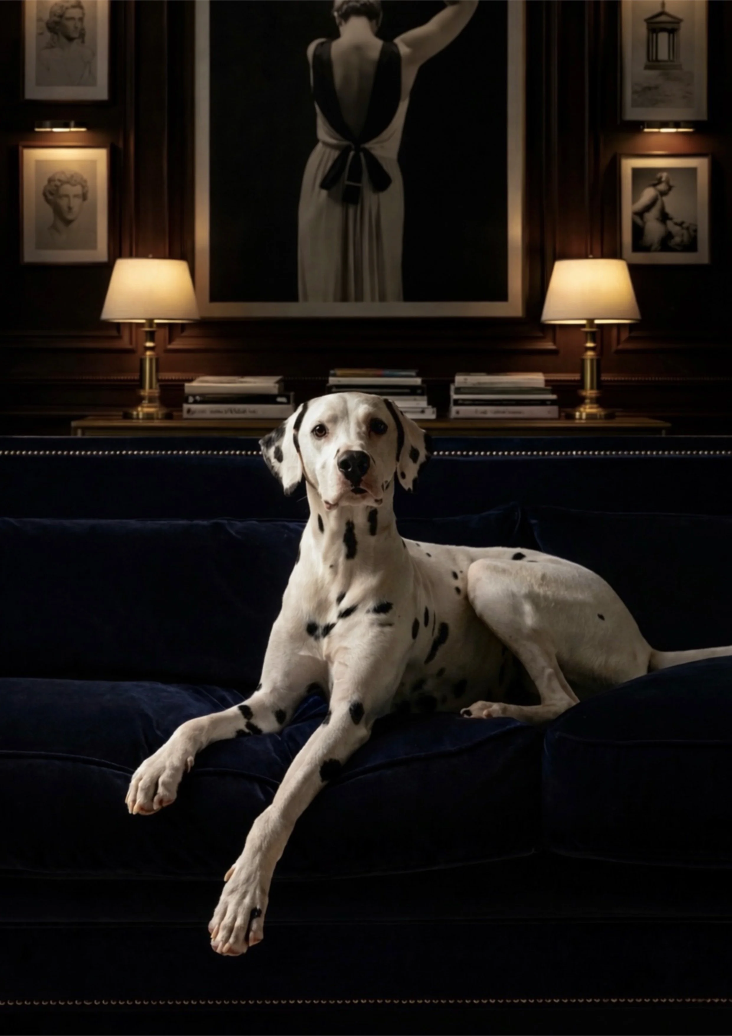 Upholstered in our Heritage Velvet, Ink; a rich, deep slate navy, the Haddleigh Sofa provided the perfect backdrop. Obi’s markings effortlessly created a striking contrast. He looked extraordinary. What made the experience even better was just how much fun it was to have him in the studio. Obi was impeccably well behaved, calm, and completely unfazed by the cameras and activity around him.